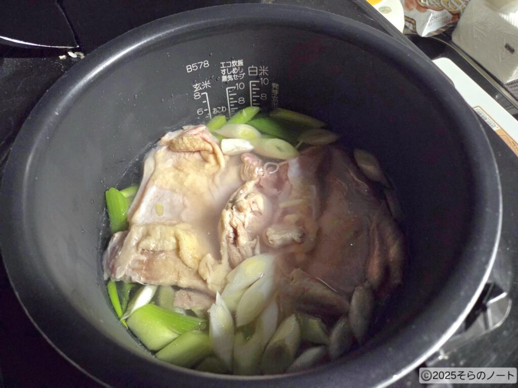 作り方は簡単で、炊飯器にお米と鶏もも肉、長ネギを入れるだけ!