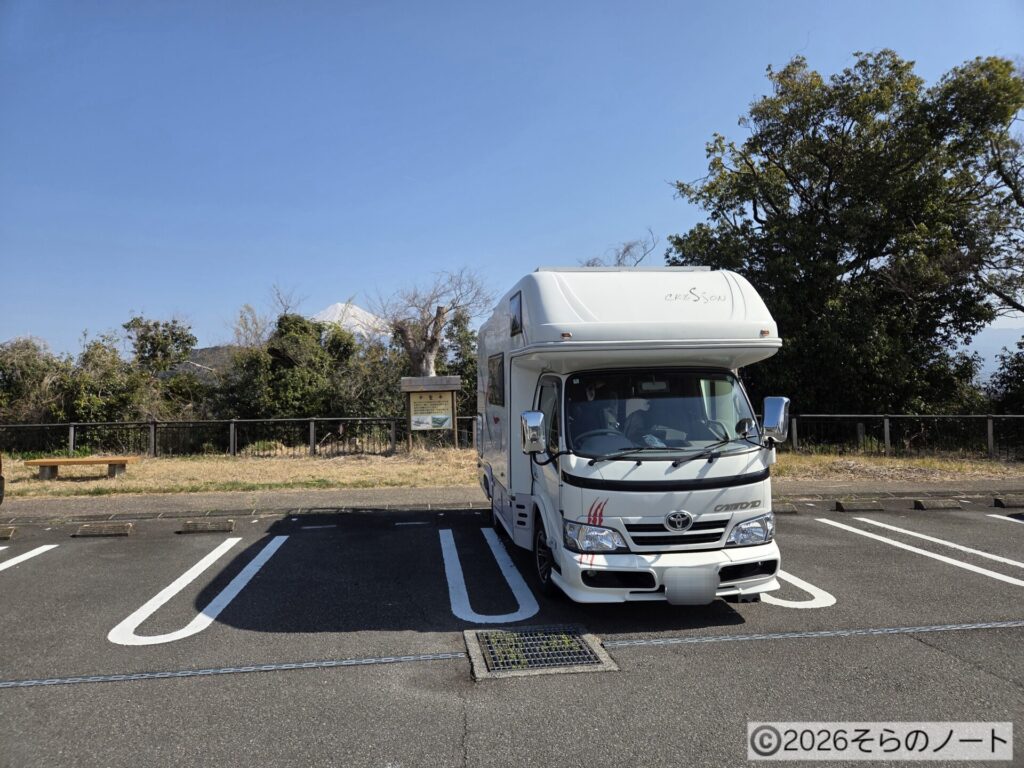 ボンクス(キャンピングカー)の後ろから少しだけ富士山が見えます♪