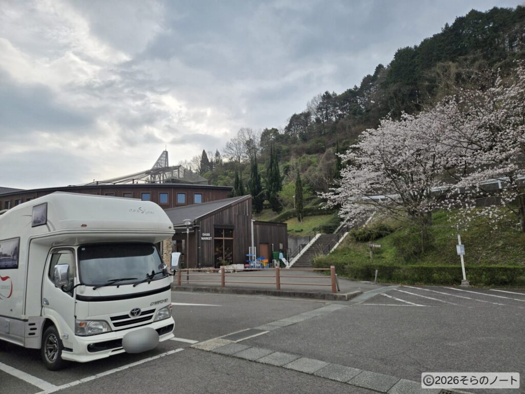 道の駅の駐車場はトイレ横が平坦だったので、そこに停めました